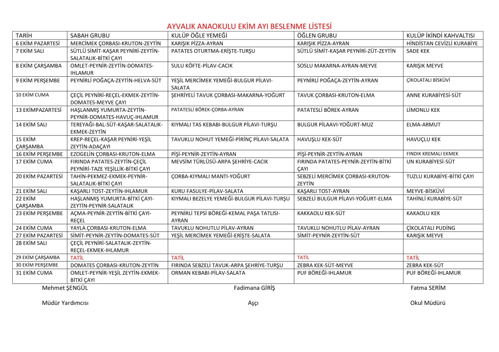 EKİM AYI BESLENME LİSTESİ